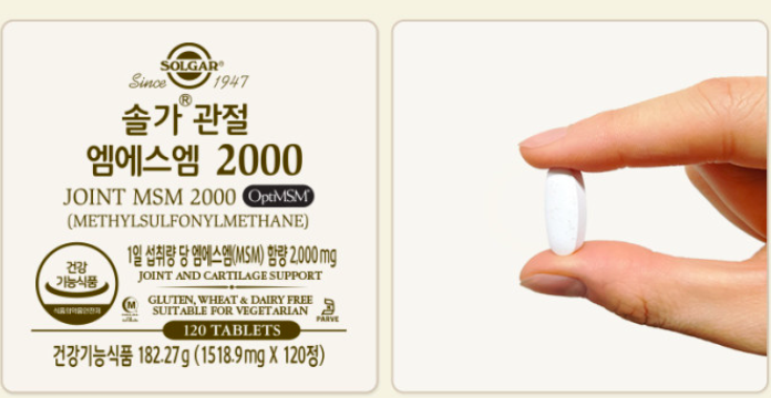 마지막 TOP 5는 솔가 관절 MSM입니다 MSM이란? 관절, 연골조직을 구성하는 중요한 성분으로 관절에 필요한 영양 및 성분을 공급하여 관절 및 연골 건강에 도움을 줄 수 있는 원료입니다. 건강할 때 꾸준히 MSM을 섭취하면 갱년기, 노년기가 찾아와도 관절 건강을 유지하는데 많은 도움이 됩니다.