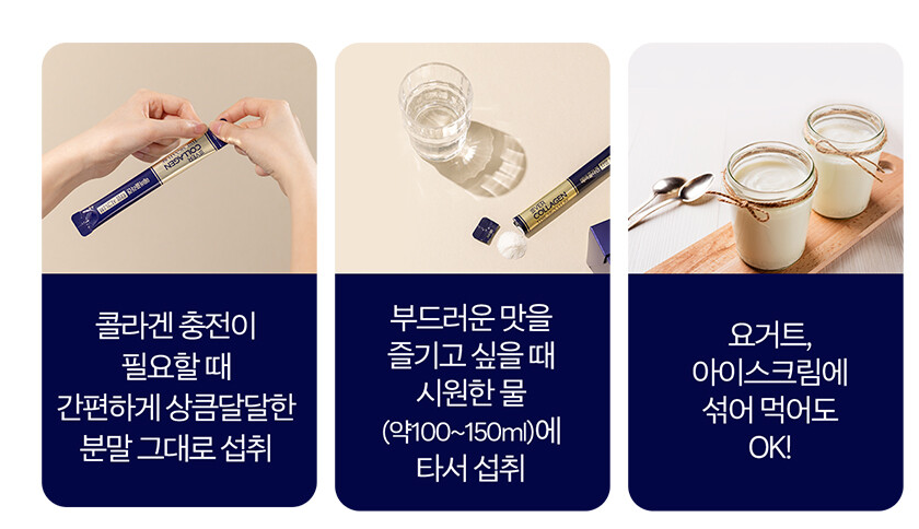 액상형, 분말형 등 다양한 형태의 제품으 있으며, 식약처 인정 건강기능식품으로 안전하게 섭취하셔도 됩니다. 분말 형태의 제품으로 1일 1포 섭취해주시면 되고 시간이나 장소 관계없이 아무때나 섭취해도 좋은 장점이 있습니다 또한, 콜라겐 특유의 비린 맛을 잡아 누구나 거부감 없이 드실 수 있습니다.