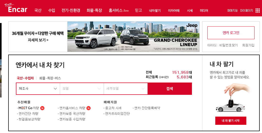 국내 최대 중고차 매매사이트라고 해도 과언이 아닐정도로 규모가 큰 사이트입니다. 중고차를 알아보시는 분들이라면 한번쯤 무조건 방문하셨으리라 생각되는데요. 엔카는 구매할 수 있는 차량 대수가 타 매매사이트 보다 가장 많으며, 15년간의 노하우와 검증된 신뢰를 바탕으로 지속적인 서비스 개선을 위해 노력하는 업체입니다.