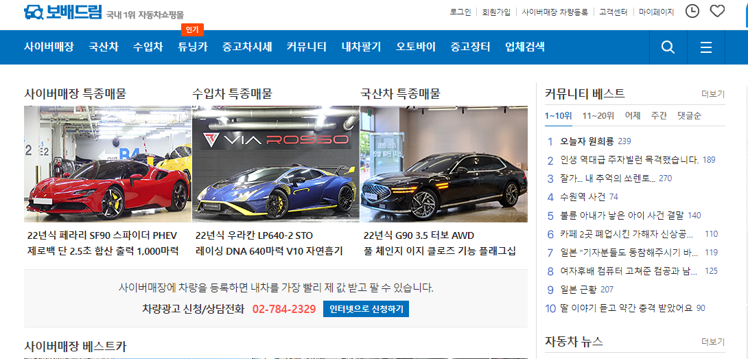 다음은 국내 최대 자동차 커뮤니티 사이트인 보배드림입니다. 보배드림은 중고차 매매사이트로 시작되었지만 현재는 커뮤니티로 더 유명해진 사이트입니다.
