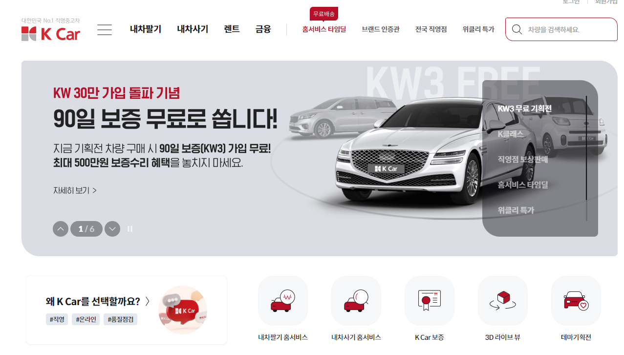 케이카는 직접 방문구매나 홈서비스를 통해 구매할 수 있으며, 3일간 차량을 운행해보고 구매를 결정하거나 환불할 수 있는 서비스를 운영하고 있습니다. 하지만 가격이 엔카 및 KB차차차에 비해 비싸다는 의견이 많으니 잘 비교해보시고 결정하시길 바라겠습니다.