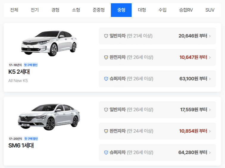 사이트에서 미리 예약하면 당일에 업체를 방문하는 것보다 훨씬 저렴하게 빌릴 수 있습니다. 업체 방문해서 차량을 빌릴 시에 대략 5~7만 원 사이인 것을 생각하면 정말 저렴하게 예약이 가능하죠.
