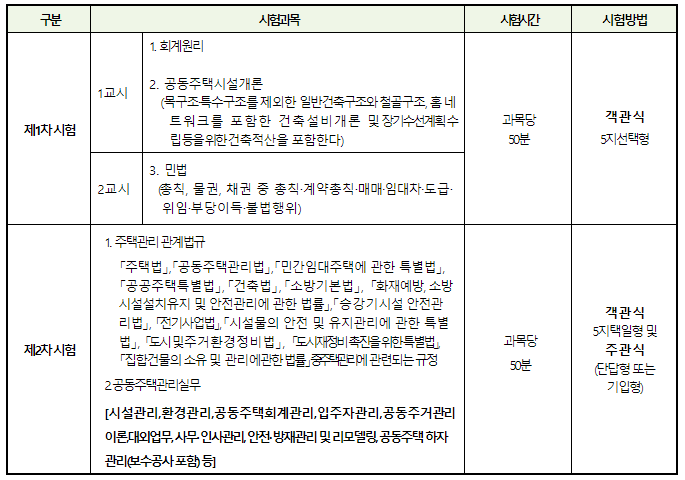 2차 시험과목은 주택관리 관계법규와 공동주택관리실무 이렇게 2가지로 구성되어 있으며, 과목별로 객관식 24문항, 주관식 16문항으로 출제됩니다. 시험시간은 동일하게 과목당 50분이 주어집니다.